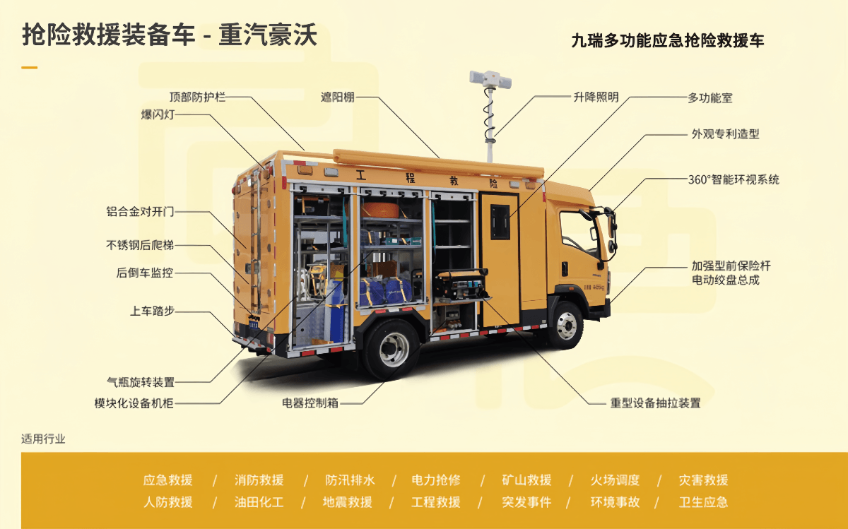 在隧道應(yīng)急救援能力建設(shè)的大背景下,九瑞汽車結(jié)合某省國家區(qū)域性公路交通儲備中心要求,研發(fā)了隧道救援整車系統(tǒng),該車擁有多模塊功能,可獨(dú)立實(shí)現(xiàn)應(yīng)急現(xiàn)場的指揮、通信、供電、照明、破拆、供水、搶險、人員救助等多種功能,達(dá)到快速、安全、高效的搶險效果;自交付客戶起,參與多起隧道、地震救援工作,強(qiáng)大的功能系統(tǒng)經(jīng)受住了現(xiàn)場實(shí)戰(zhàn)的考驗(yàn)。