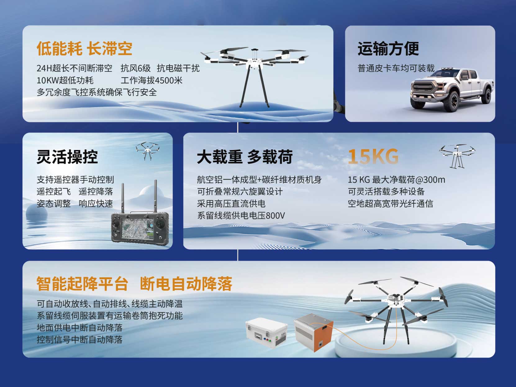系留無人機:24H超長不間斷滯空、抗風(fēng)6級、抗電磁干擾、10KW超低功耗、工作海拔4500米、多冗余度飛控系統(tǒng)確保飛行安全;