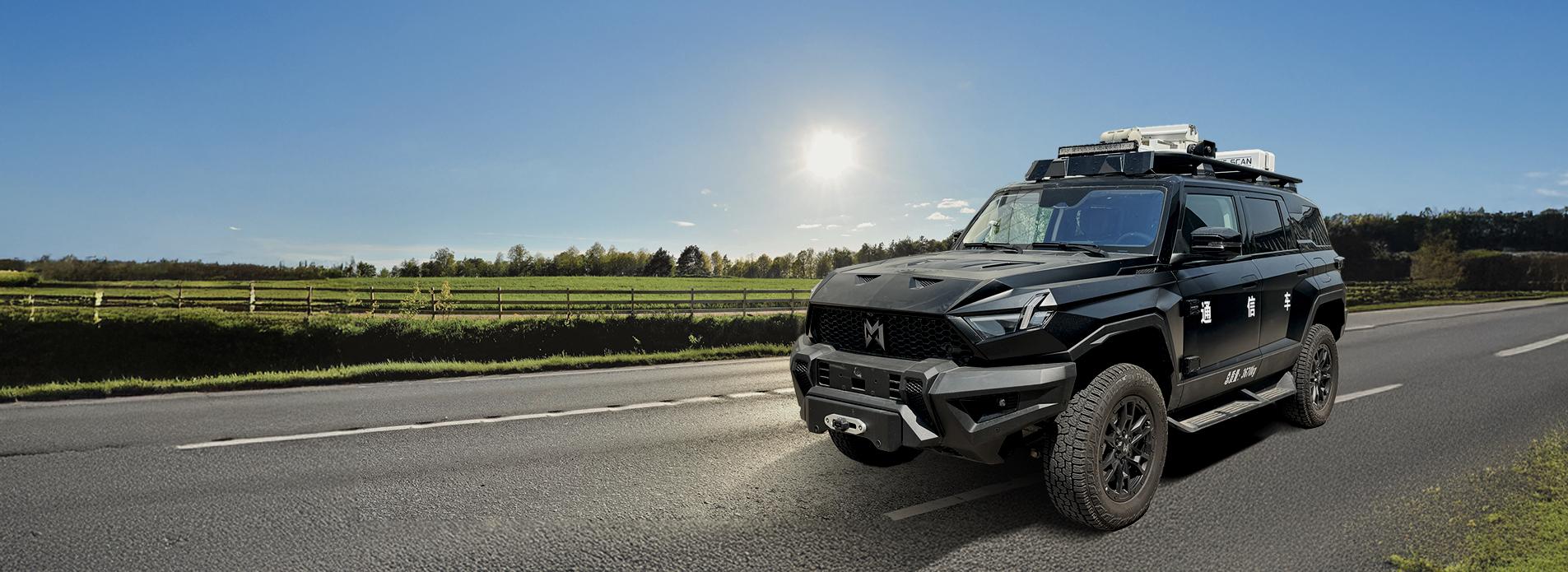 動(dòng)力系統(tǒng)采用增程式混合動(dòng)力,能輸出最大816匹馬力和1050N·m的最大扭矩,續(xù)航里程可達(dá)600km,可滿足長(zhǎng)距離、高強(qiáng)度任務(wù)需求。車輛整備質(zhì)量3500kg,尺寸為長(zhǎng)5096mm、寬2080mm、高2314mm,軸距2950mm。此外,車輛滿足公安B級(jí)防爆標(biāo)準(zhǔn),配備防爆涂層、TPE玻璃防爆膜和防爆胎等,安全性高。